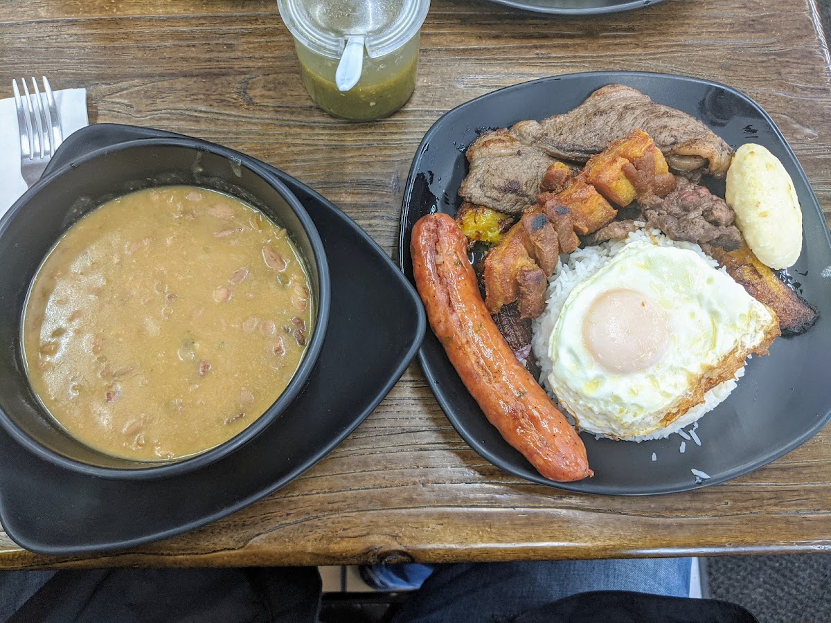The food lineup showcases traditional Colombian comfort fare. House specialties like Mini Bandeja Paisa—a hearty plate with rice, beans, grilled meats, pork skin, eggs, and plantains—highlight the type of filling, well-rounded meals here. The restaurant also serves options such as grilled steak with onions, accompanied by classic sides like white rice, beans, and fresh salad, emphasizing straightforward, familiar ingredients prepared with care.